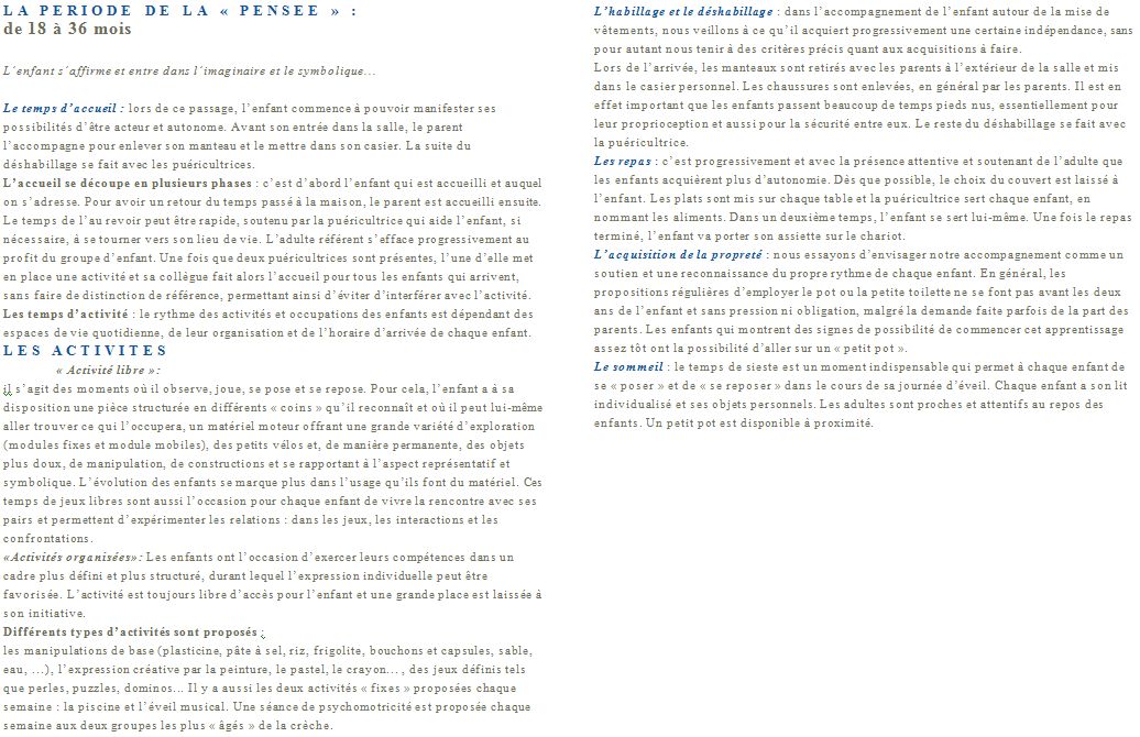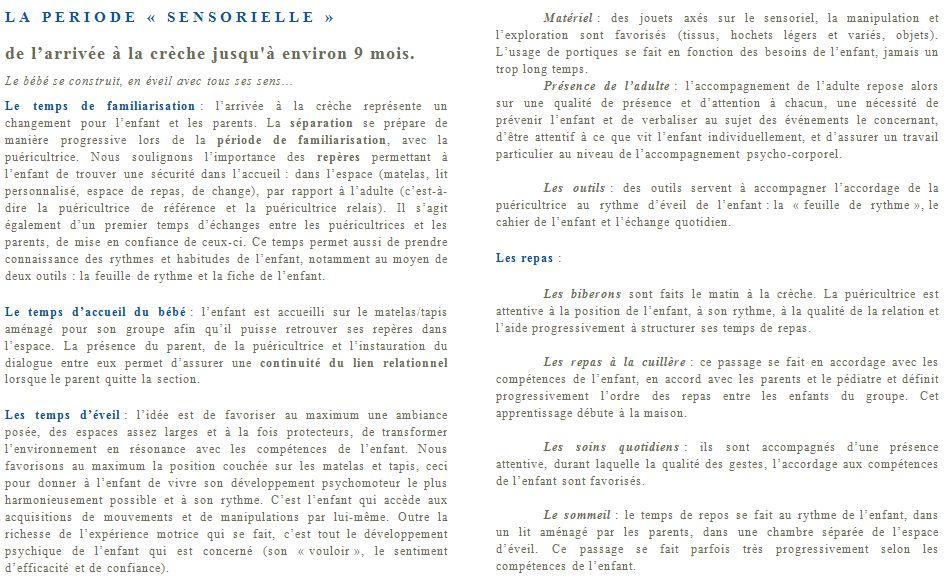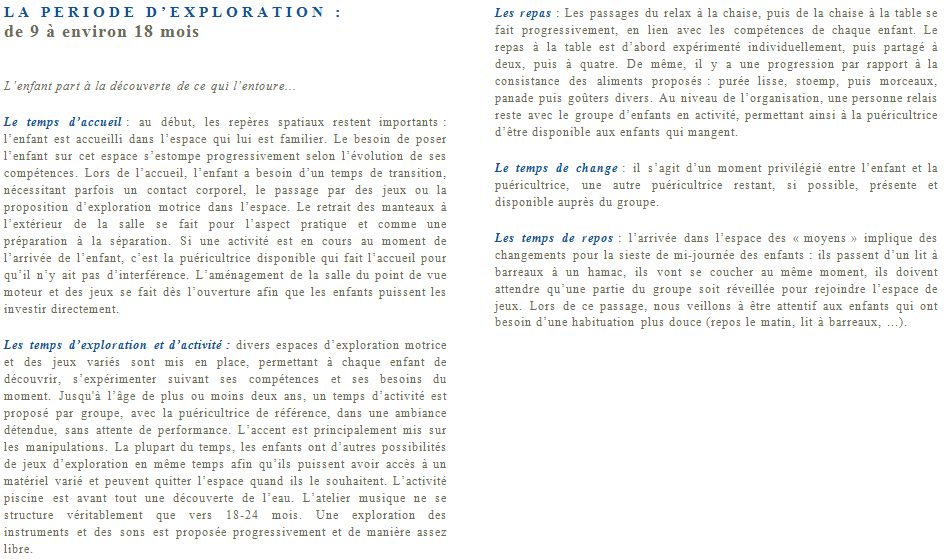 Sur base de références théoriques et issues des pratiques quotidiennes, nous définissons globalement trois temps dans le développement de l’enfant : la période sensorielle les 6 à 9 premiers mois de la vie, la période d'exploration entre 9 et 18 mois et la période de «l'affirmation de soi et du jeu symbolique » entre 18 mois et 3 ans. Cette approche va de pair avec une vision de l’enfant dans sa globalité et son individualité, le respect de son rythme propre.